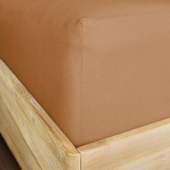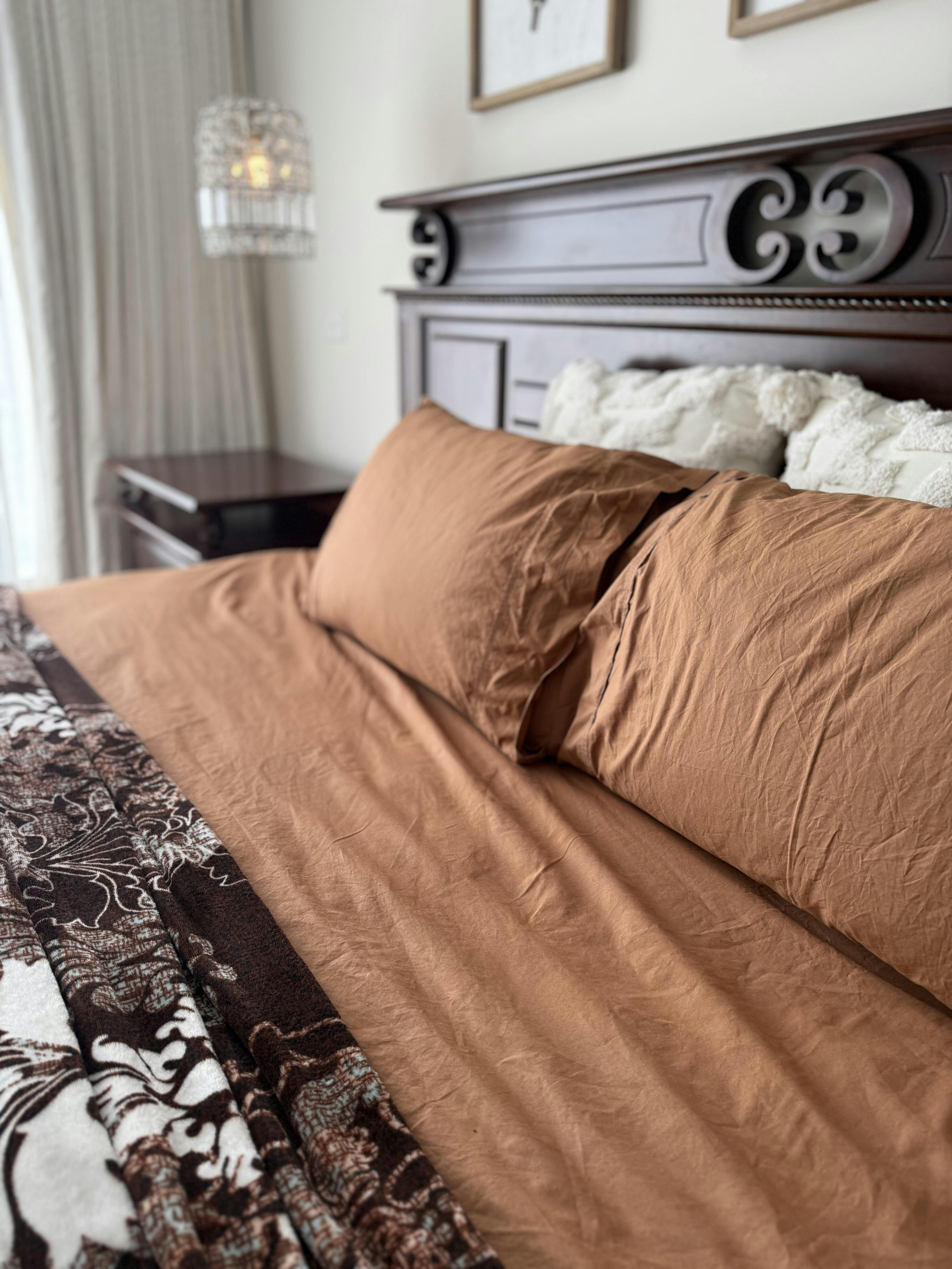The terracotta organic cotton bedsheet is soft, breathable, and feels premium. The colour is rich and warm, and it washes well without fading. . Love the thoughtful labels like “right corner” that make putting on the fitted sheet super easy. Beautiful quality and eco-friendly — highly recommend!